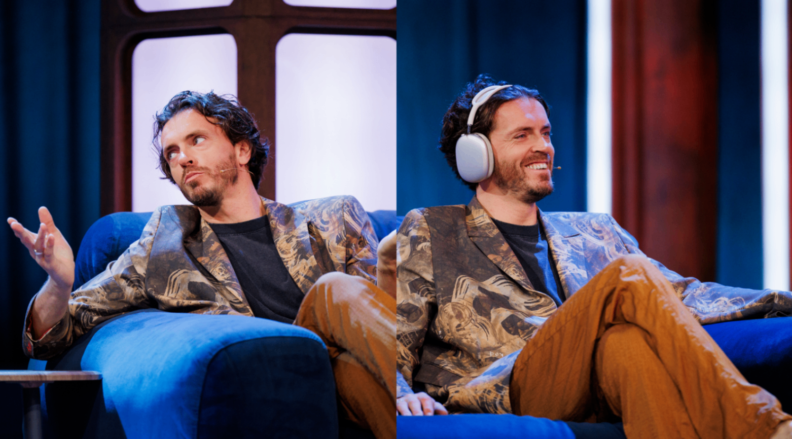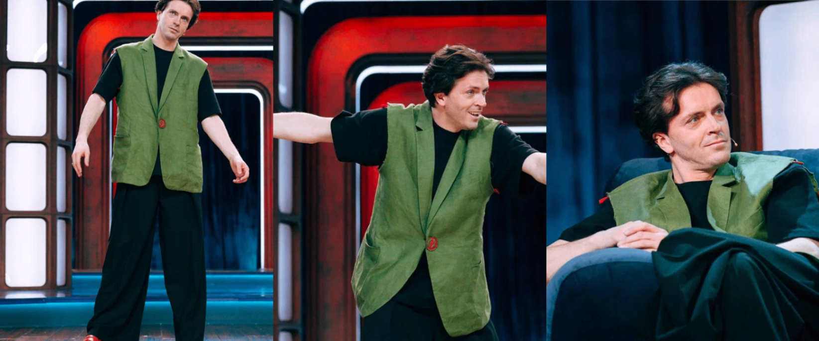 Арсений в пиджаке "Жук" - тотемный символ бренда, вышивка которого была сделала по эскизу 9-летнего Матвея.