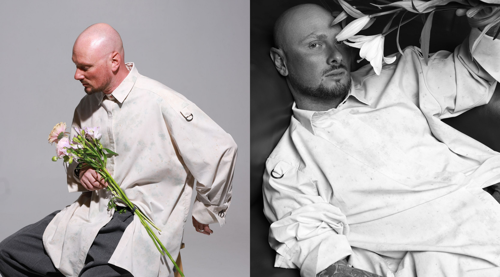 На Сергее двусторонний пиджак KОD оверсайз из фактурной хлопковой ткани, бархатистая, словно лепесток розы. Несмотря на свою мягкость, пиджак не продувается и не намокает - может смело использоваться в качестве верхней одежды. Вышивка, торчащие нитки и открытые срезы придадут образу небрежности и бунтарства.