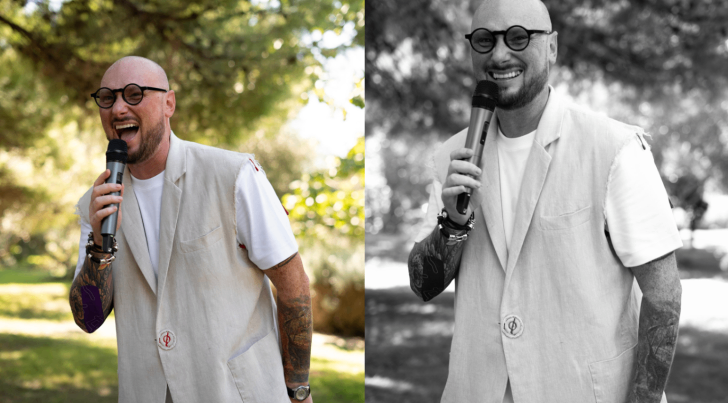 Сергей в костюме изо льна, араратский зеленый - двусторонние модели: жилет + брюки-бананы - летняя база KОD. Универсальный и практичный костюм за счет спокойной лицевой стороны, но такой же яркий за счет 2-го лица с красной окантовочной лентой. Араратский зеленый - приятный, натуральный и богатый цвет для жаркого лета, а нам такое нужно!