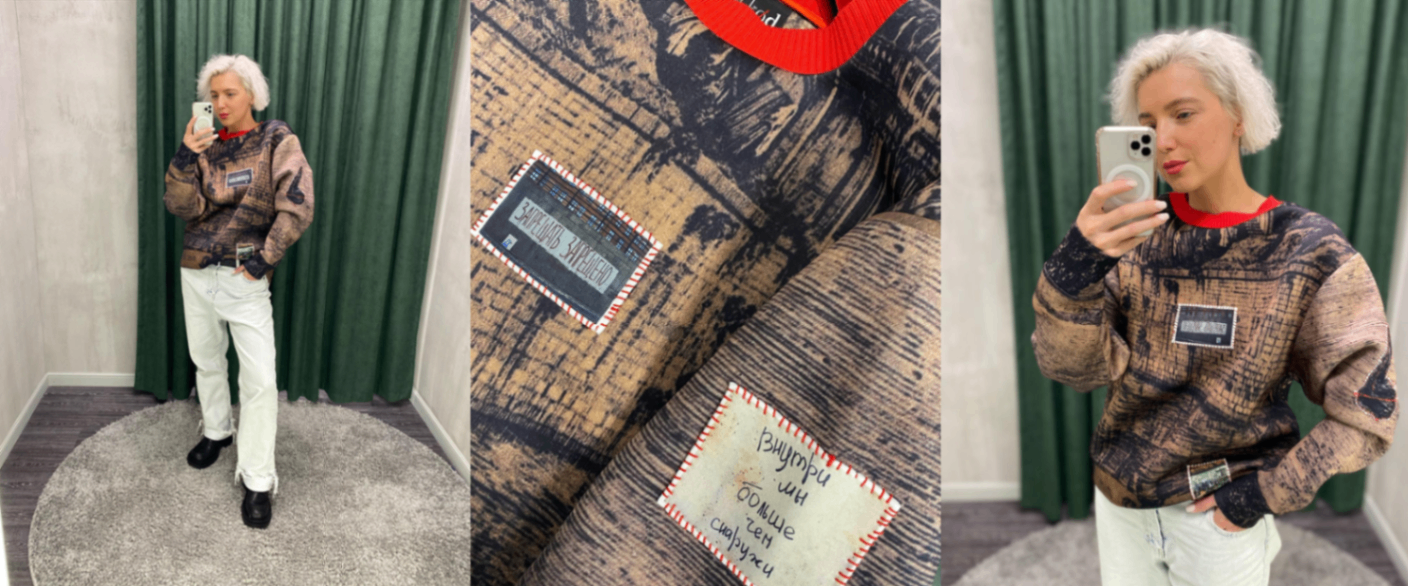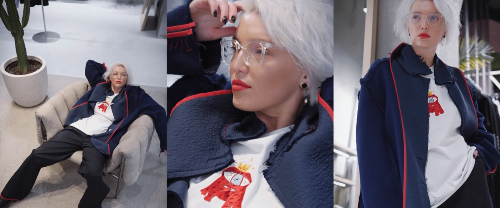 Някия в Футболке белой из хлопка “Королева kod“, объемная футболка с нетипичной квадратной проймой и вышивкой рисунок, которой делал 7-летний Матвей, главный художник бренда. В Брюках "Холст черный", классическая хлопковая модель с двусторонним ношением, и Фактурном пиджаке-пальто с обтекаемыми линиями и двусторонним ношением.