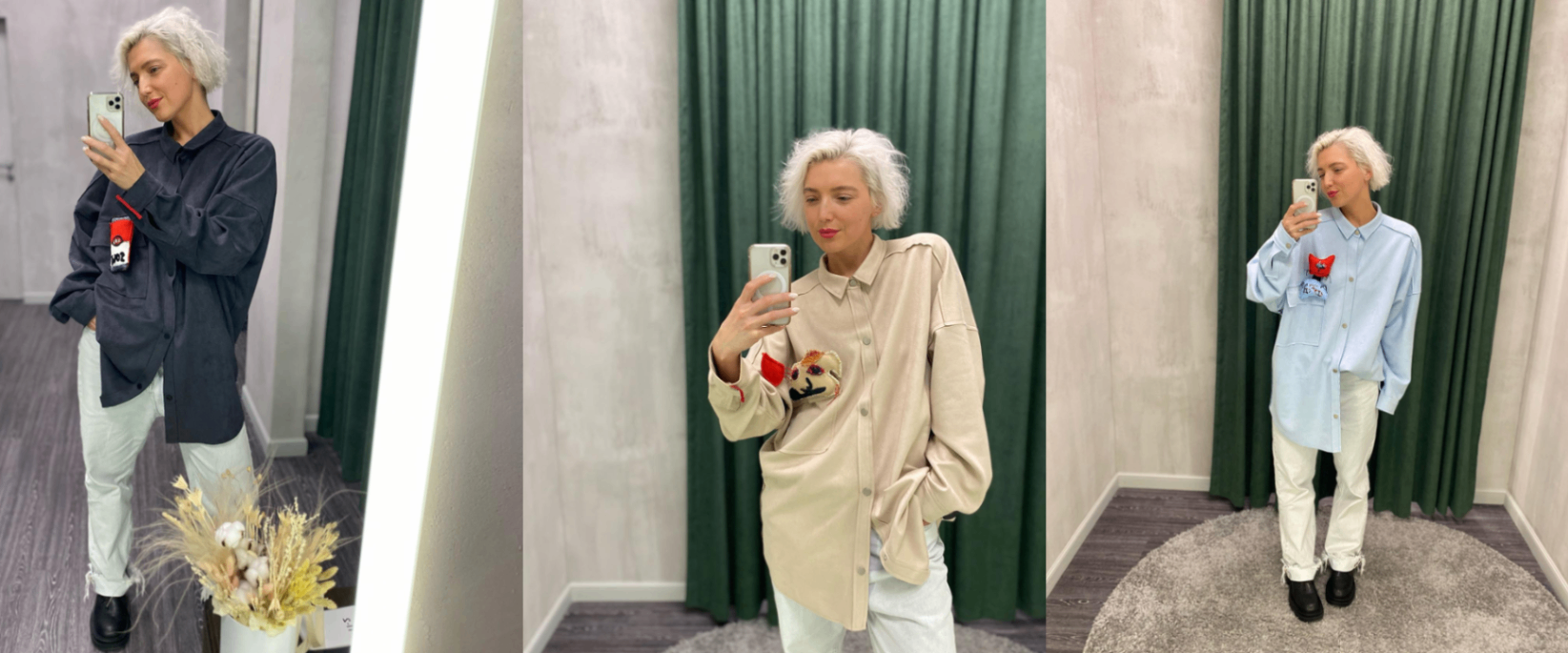 Някия в Рубашках из мягкой замши в трех цветах: петербургский серый, неаполитанский телесный и небесно-голубой. Модель свободного кроя с открытыми срезами и авторской брошью. Ткань мягкая, невесомая, и совсем не мнется.