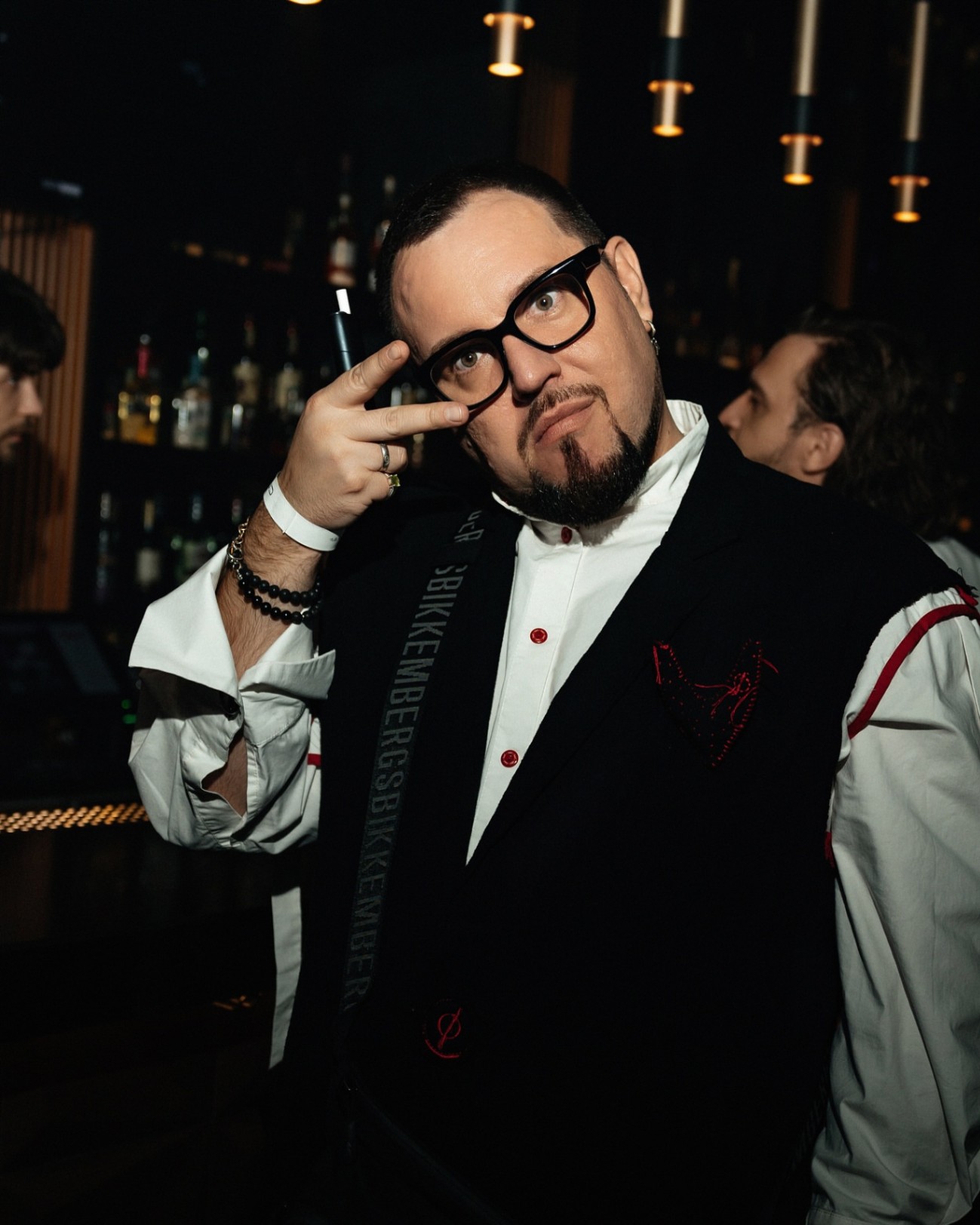 Сергей в муслиновом двустороннем жилете. Здесь и объемный шеврон, и эффектная обработка краёв красной фирменной бейкой KОD, и свободный, непринуждённый крой, и открытые, хулиганские срезы проймы, то, что нужно для ведущего.