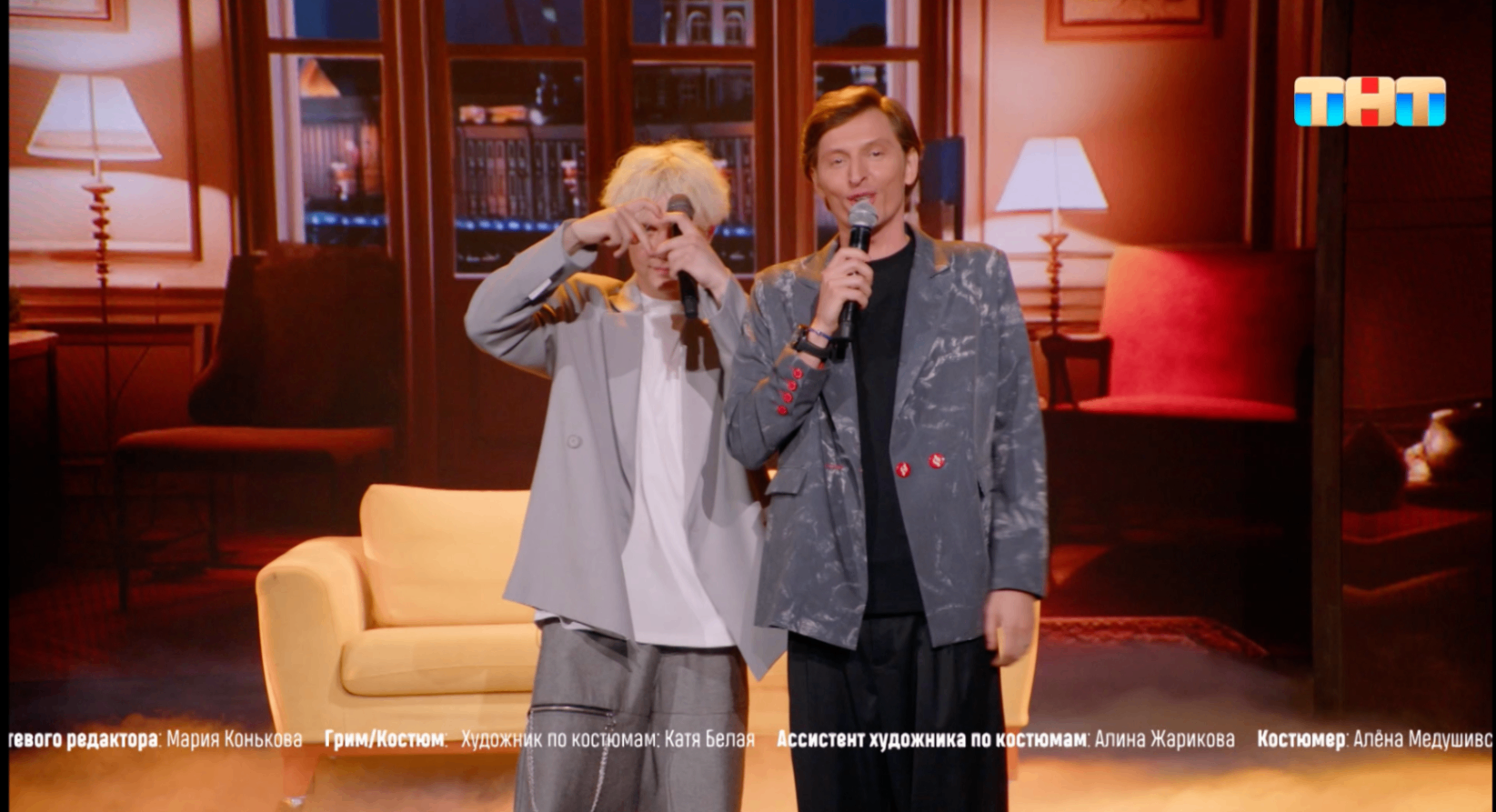 На Павле костюм-холст "Листья" - истинный холст художника. Надевая "Листья", вы растворяетесь в искусстве, становитесь его частью, транслируете миру свою непохожесть. Мягкая ткань костюма позволяет сидеть долгое время в студии или двигаться очень активно, оставаясь гладкой, без заломов, то, что нужно ведущему.